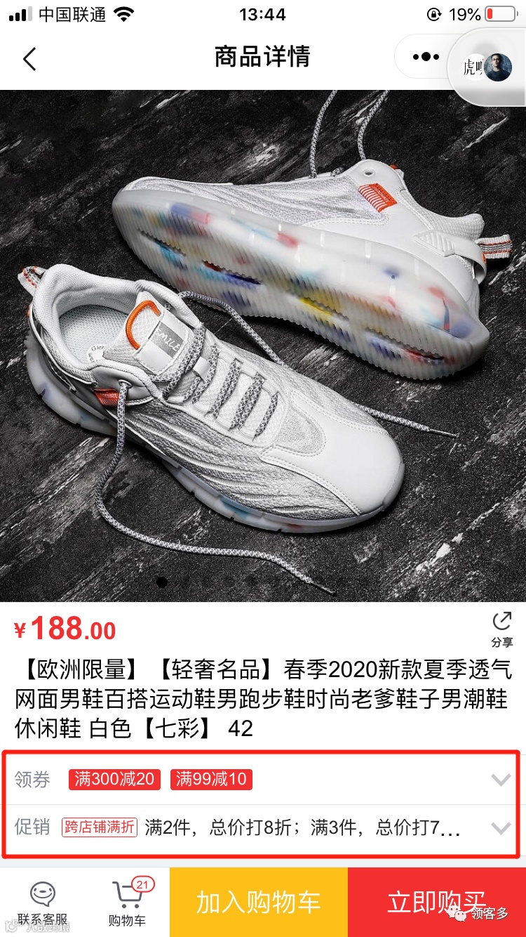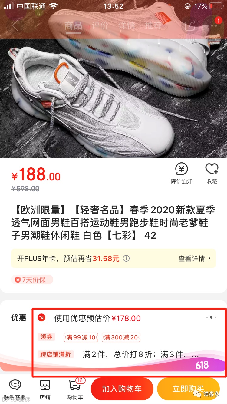 这是在京东APP上面的一款运动鞋商品。我们可以看到,这双鞋原价为188元,可以使用的优惠有: