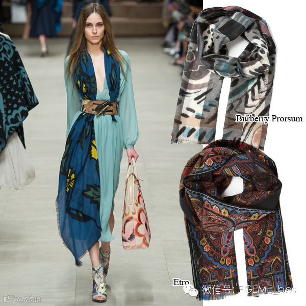 Burberry的民族风印花和手绘涂鸦在本季可谓出尽风头。超大size的飘逸围巾(称作披肩也不为过)一长一短地被宽腰带固定在胸前,不仔细看还以为是长裙的一部分。这种围法最适合搭配风衣、长裙、阔腿裤等拥有宽大飘逸下摆的单品。