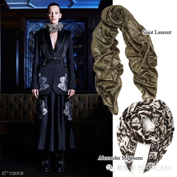 人们在Alexander McQueen的秀场上不禁感叹:猫若是有9条命,那豹纹就有900条。年年出现、季季翻新的豹纹在McQueen秋冬系列中被巧妙地卷成细条,环绕脖颈两圈再被打结。本季,SaintLaurent以细碎豹纹印花搭配金属色,McQueen则豹纹骷髅头统统加身—— 两款围巾不容错过。