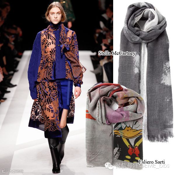 日本品牌Sacai风趣地用一只大号曲别针把轻薄飘逸的围巾别在了毛衣上。你可以效仿Sacai找来一只大号别针或一只漂亮的胸针当作围巾的配饰。在围巾选择上,可以继续突出趣味又颇具新意的主题,比如Faliero Sarti的唐老鸭印花和StellaMcCartney的唯美的山水画。