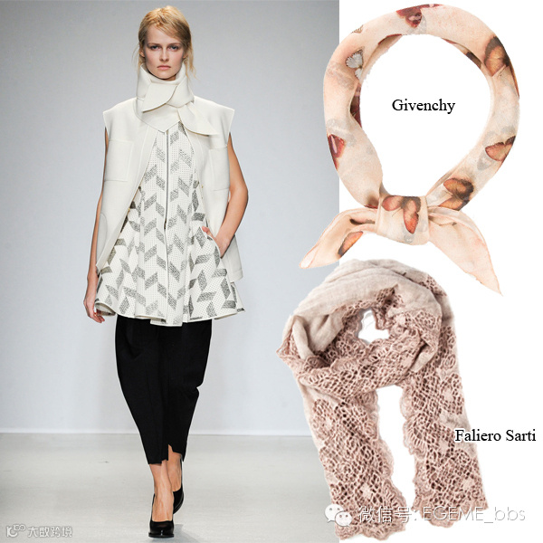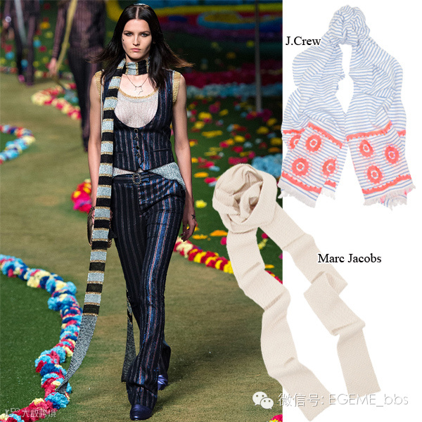 TommyHilfiger的围巾囊括了本季两个最时髦的元素:横条纹和细长款。这里的横条纹可是大有学问—— 由于方位变换,系在脖子上的那部分围巾变成了竖条纹,无形中起到了拉长颈线的作用。除了神奇的竖条纹,细长飘逸的围巾可以减少毛衣或风衣等秋冬衣物的厚重感,同样有助于使脖颈在视觉上显得更纤细。