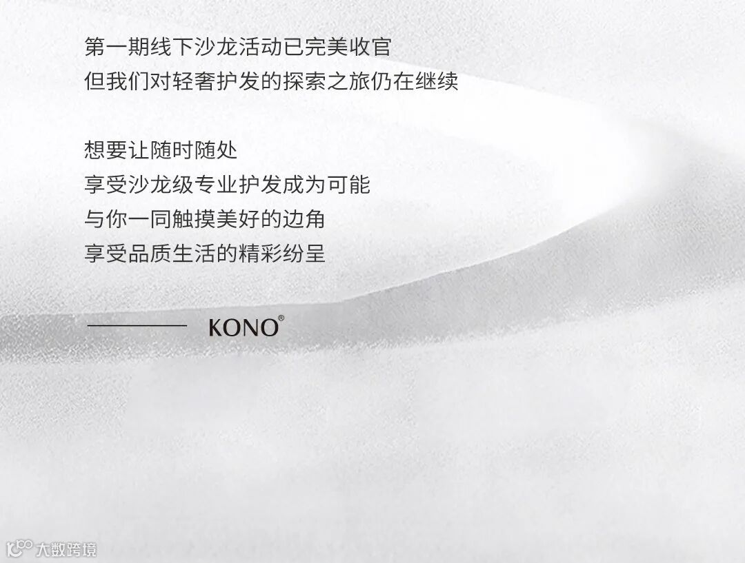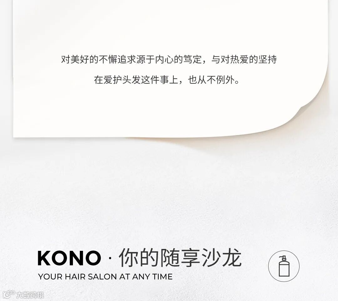 KONO是一个专业护发品牌。始终坚持以满足用户对护发的极致追求为导向,从全球引进原料及先进技术,用专业护发沙龙的标准进行产品研发,精研功效护发产品,让每个人随时都能享受沙龙级的护发体验。