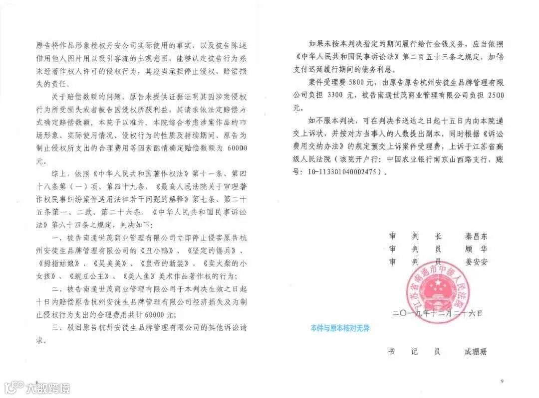 为保护知识产权和所有合作方及消费者的权益,侵权行为发现一起打击一起,按(2019)苏06民初539号民事判决书为例,我方著作财产权再次得到国家的维护,判决书中认定我方系安徒生作品的著作权人,明确了我方在其文学。艺术、科学领域具有独创性,并能以有形形式复制智力成果。