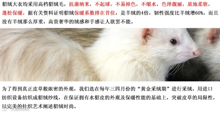 客供上等进口貂绒,貂绒是近几年设计师们最爱的设计原料,不起球,不变形,亲肤性极好,很容易穿出高端感。