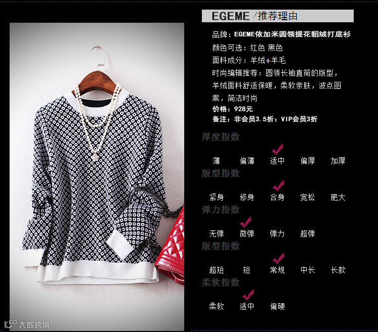 关于貂绒:保暖度是羊绒的两倍!不起球,但有浮毛,是浮毛,不是掉毛哦 !EGEME依加米圆领提花貂绒打底衫,采用最适合肌肤的柔软面料,前者注重简约,后者注重奢华,毛被超纤细,更柔软亲肤!