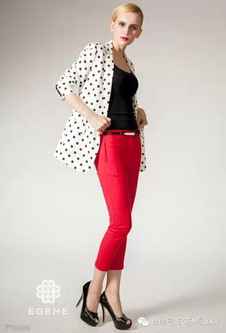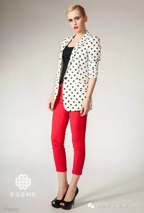 波普风再次大热,尤其是波点元素,备受女生的喜爱,大波点象征着自由和豪放,而小波点则代表了法式的浪漫和优雅。这件波点状白西装,成稳中不失浪漫,搭配上红色的九分裤,你就是职场达人!