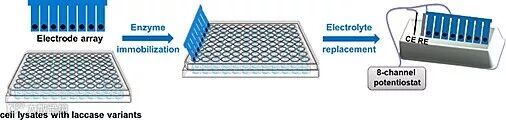 酶定向进化技术的核心在于基因突变库构建和筛选平台的建立。筛选平台在很大程度上决定了一次定向进化的成败。对于氧化还原酶的生物电催化活性提高,最有效的筛选就是借助电催化测试体系。亚琛工大张玲玲项目小组自主搭建了一套电催化漆酶筛选平台。在此平台中,多通道恒电位仪搭载多电极阵列,实现了对96孔板里漆酶变体活性的快速高效筛选。最终,漆酶CueO变种D439T/L502K对氧气还原的催化电位正移了0.12 V,从热力学角度来看,极大地降低了漆酶电催化反应的过电势,提高了葡萄糖/氧气生物燃料电池的开路电位。该工作作为酶定向进化在生物燃料电池领域的一次成功尝试,为未来酶生物燃料电池的发展提供了更多的潜力和可能性。