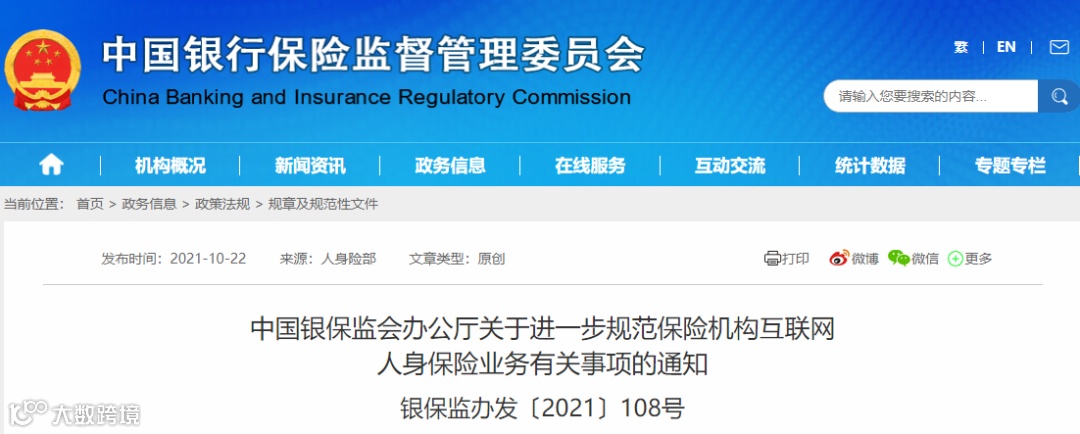 10月22日,银保监会正式发布《关于进一步规范保险机构互联网人身保险业务有关事项的通知》,要求在今年12月31日前全面剔除不合规的保险产品。
