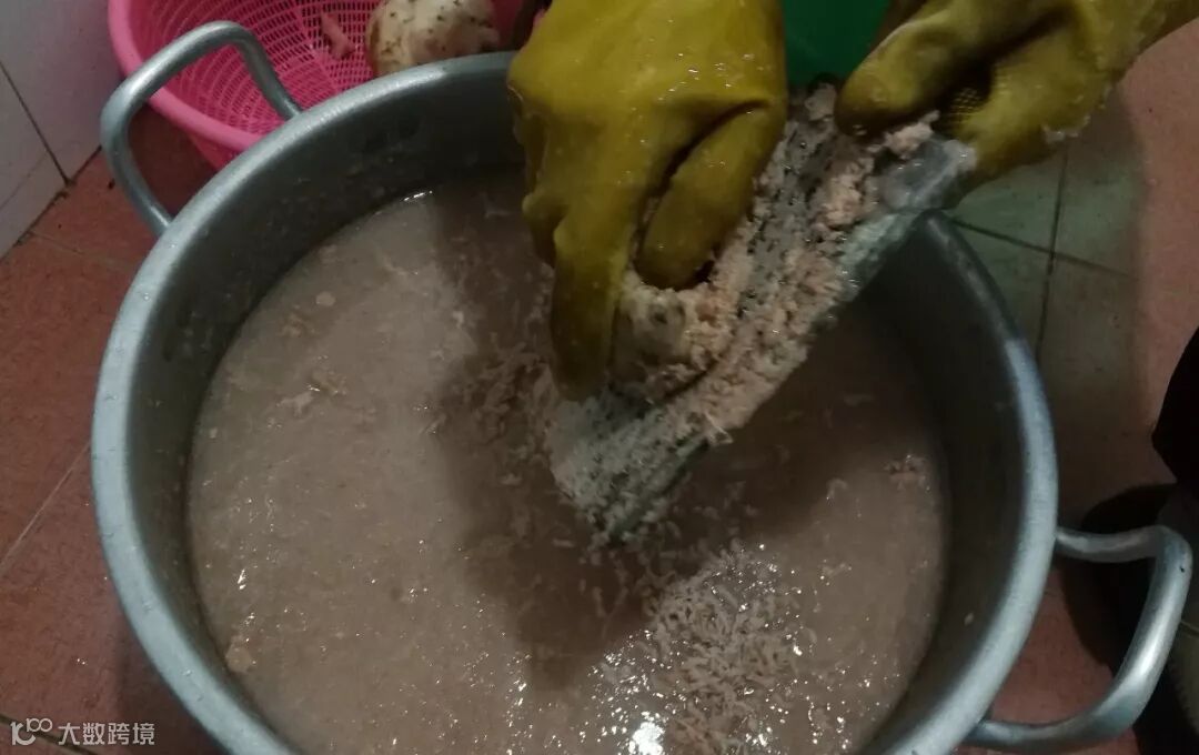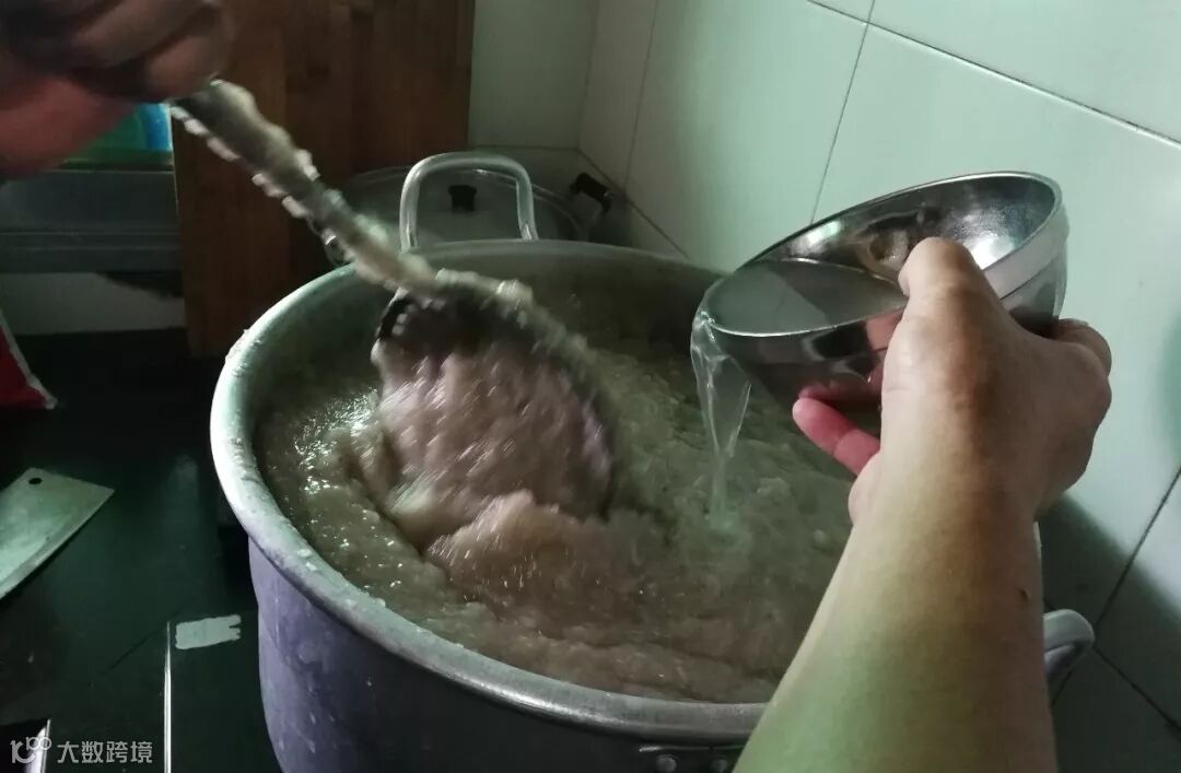 加碱这道工序技术含量不是很高,但是必须熟练掌握放碱的火候,碱的重量,碱和开水的比例,这些对游大姐来说已经驾轻就熟。