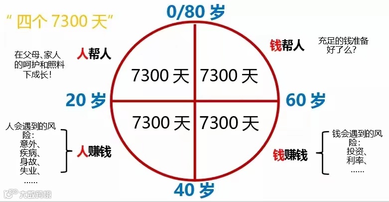 很有意思的一张图,一生中4个7300天.... 从被抚养到会赚钱到能投资到要养老 每个阶段都有不同的责任,不同的方向,而人生需要规划,风险更需要!