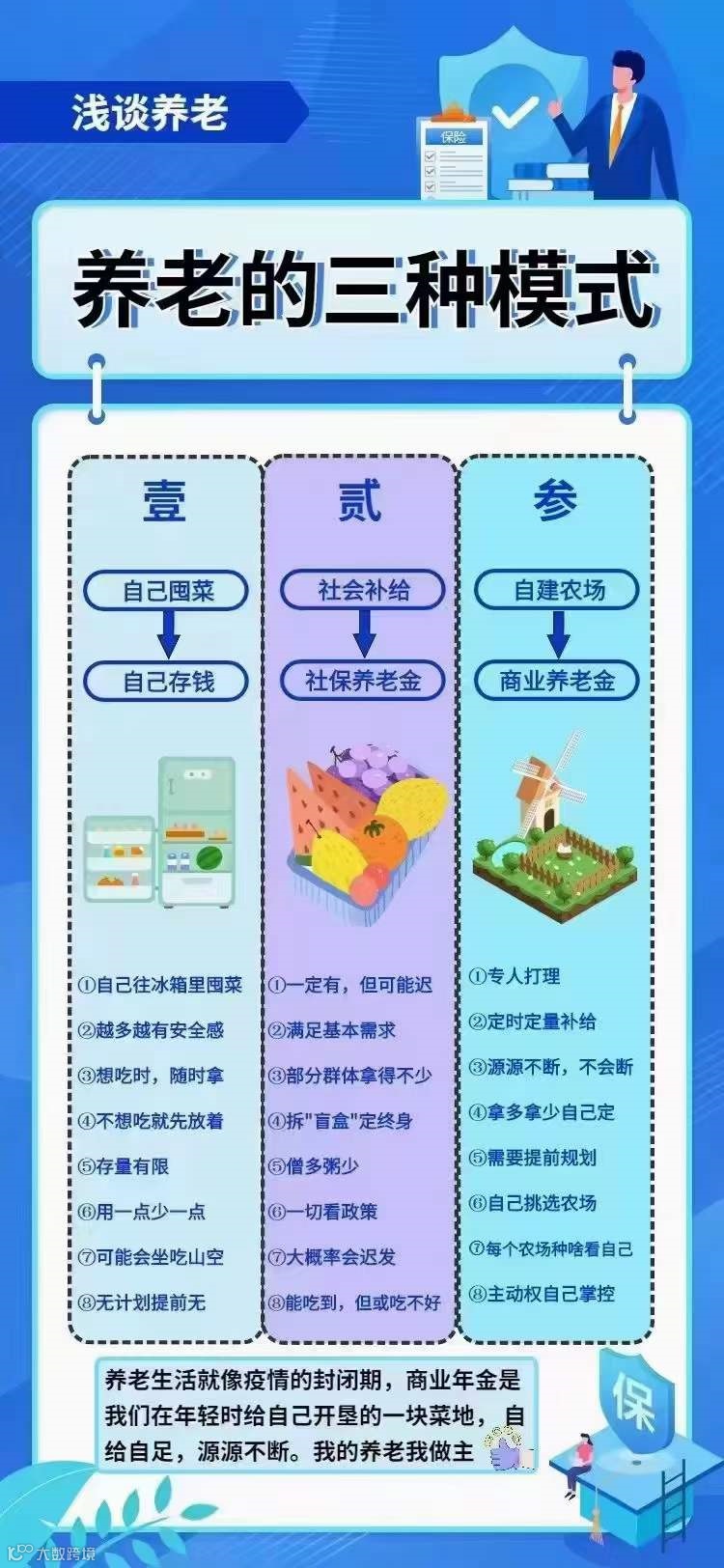 自己囤菜(会吃完)——自己存钱社会补给(一切看政策)——社保养老 自建菜园(源源不断)——商业养老金 [让我看看]三种养老模式,你pick哪种?