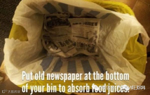把废报纸垫在垃圾桶底,垃圾桶就不会再湿漉漉、黏糊糊了。