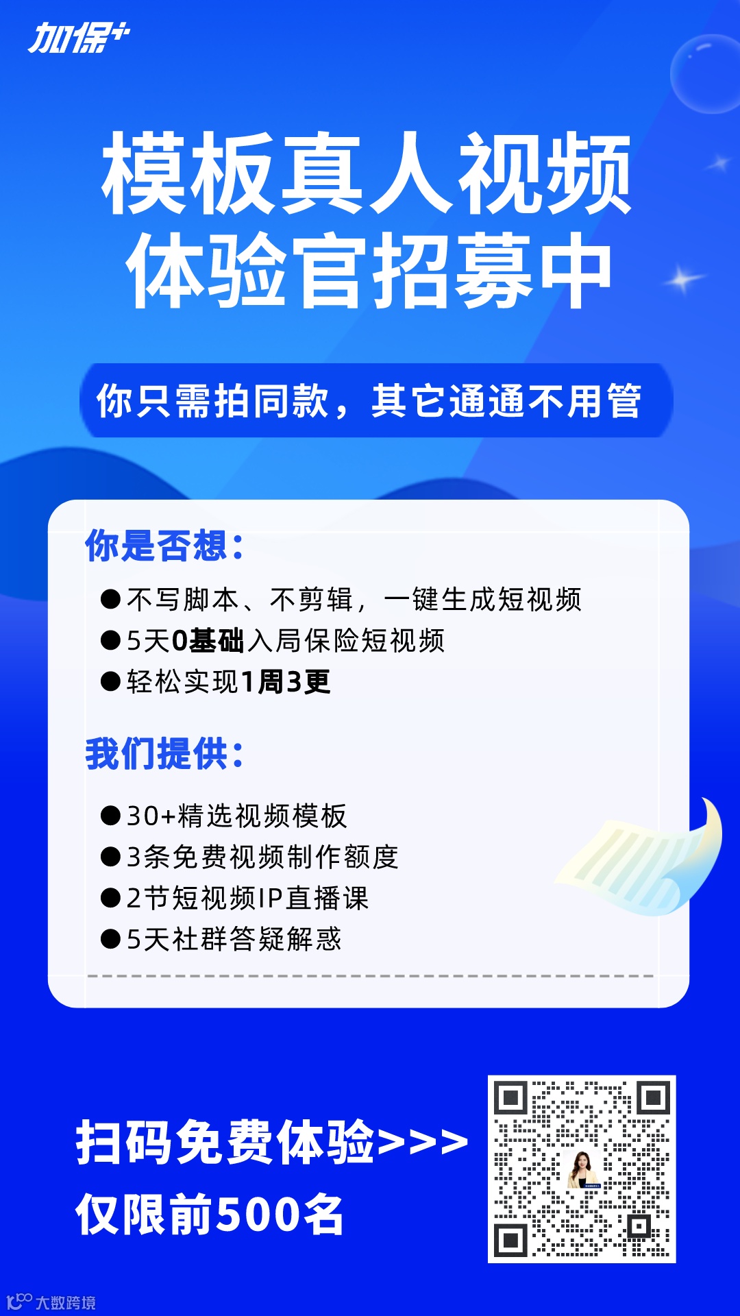 再次提醒,先到先得,手慢无!赶紧扫码加入成为【模板真人短视频】体验官吧!视频获客、IP爆款就是现在↓↓↓