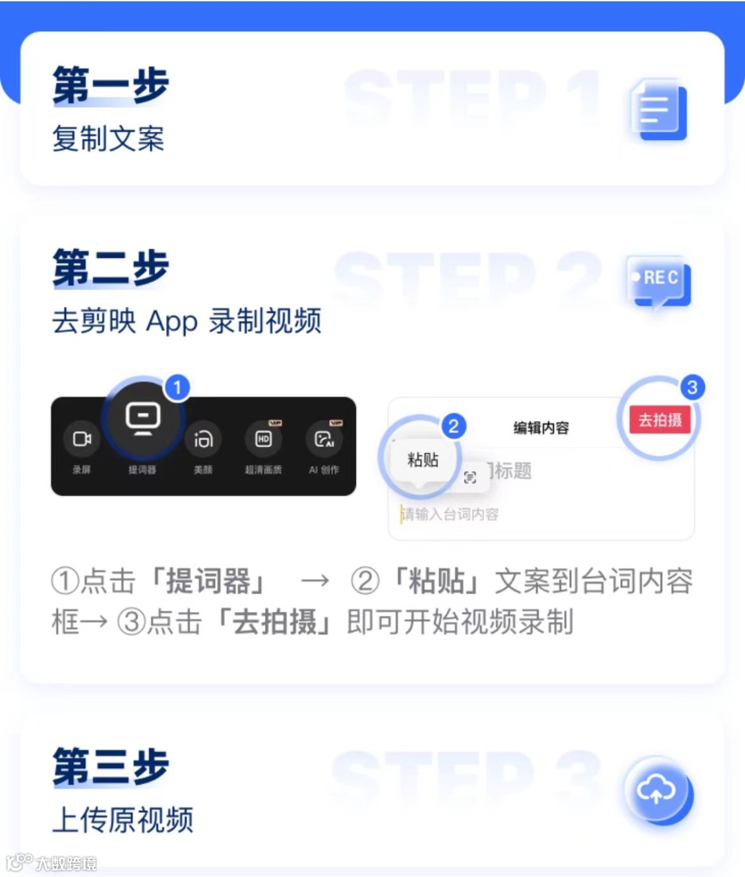你只需要挑选心仪的视频模板,然后照着模板中自带的脚本对着手机录一遍即可。像这样简单三步,