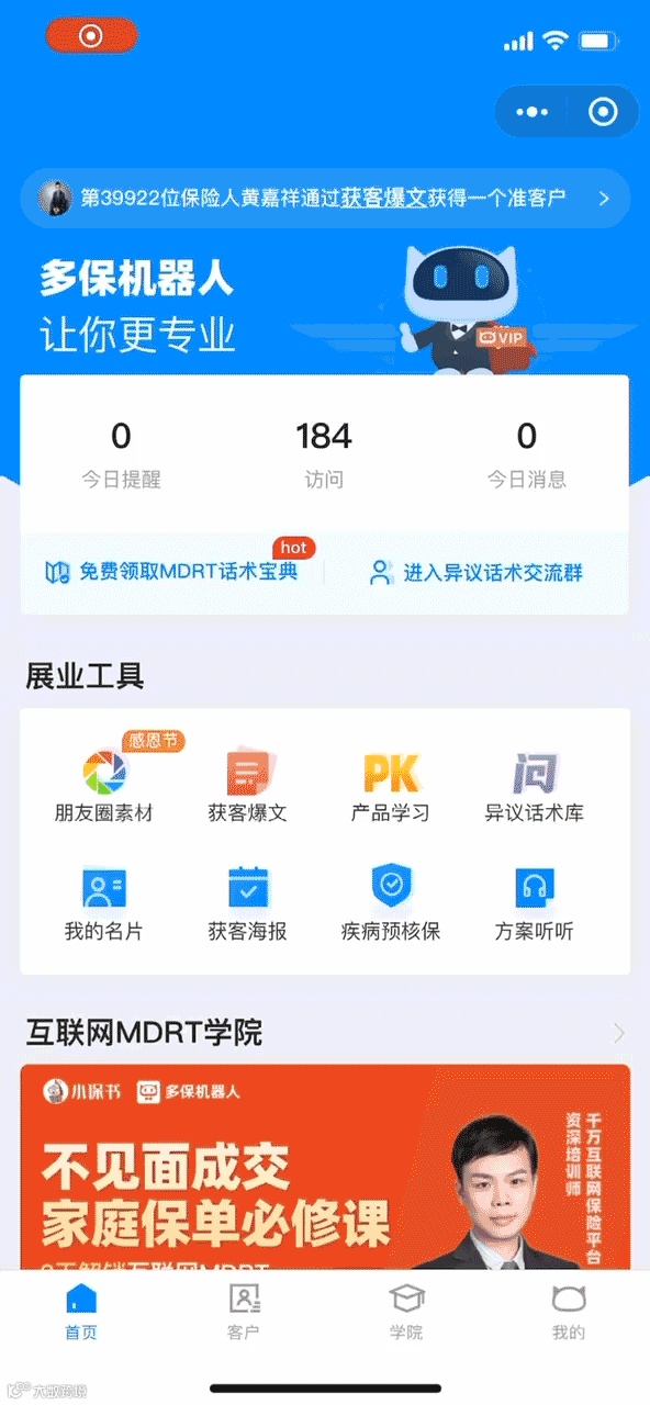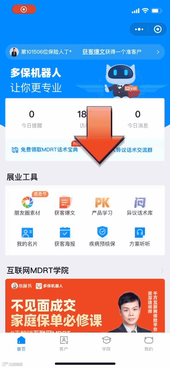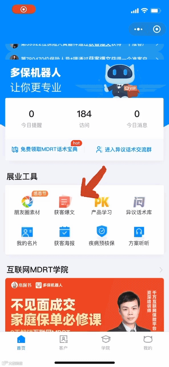 保险老师可以直接进多保机器人小程序,一键分享转发至朋友圈展业获客。