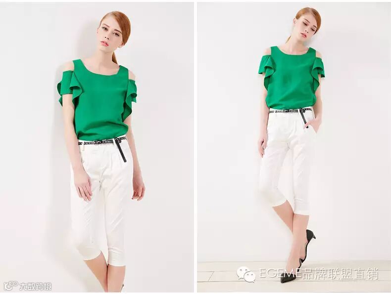 白色裤子搭配绿色短袖衫,瞬间映衬白皙清澈的五官面容。给人一种清秀的美。
