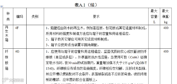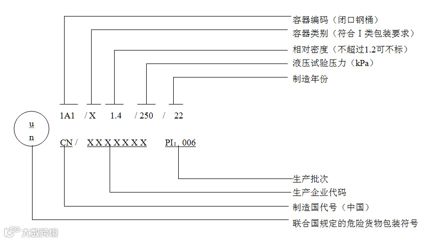 为了清楚地表示危险品包装容器(外包装)的类型/材料和型式,采用了编码形式对每一种包装容器用一个特定的代码表示。包装编码一般由并列排布的三部分组成: