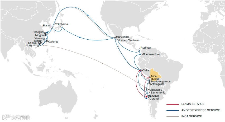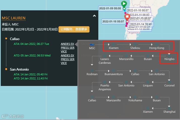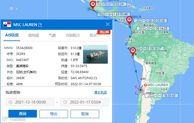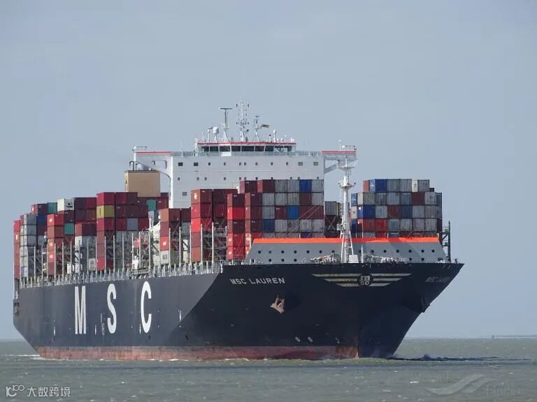 这艘满载中国货物的“MSC LAUREN”轮部署AES航线(ANDES EXPRESS SERVICE)航线上,11月曾挂靠上海、厦门、蛇口、香港、宁波等港口,涉及HAPAG-LLOYD、HMM、MSC、ONE四家船公司共舱。
