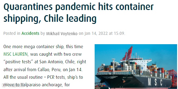 1月12日,赫伯罗特旗下“GUAYAQUIL EXPRESS”因一船员成阳性而被迫中断航行,已被转移到瓦尔帕莱索锚地“隔离”。“MSC LAUREN”是过去11天内被智利卫生当局禁止靠泊(上述两艘加上 MSC BRANKA和 MT ARICA)4艘船中最近的一艘。