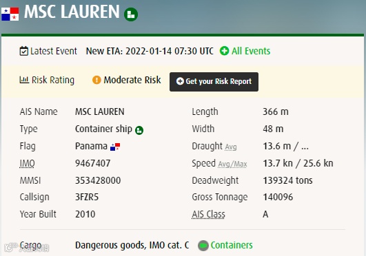 “MSC LAUREN”轮运力为12400TEU,建造于2011年,全长365.85米,宽48.44米。事发时这艘悬挂巴拿马旗的船只正圣安东尼奥港。