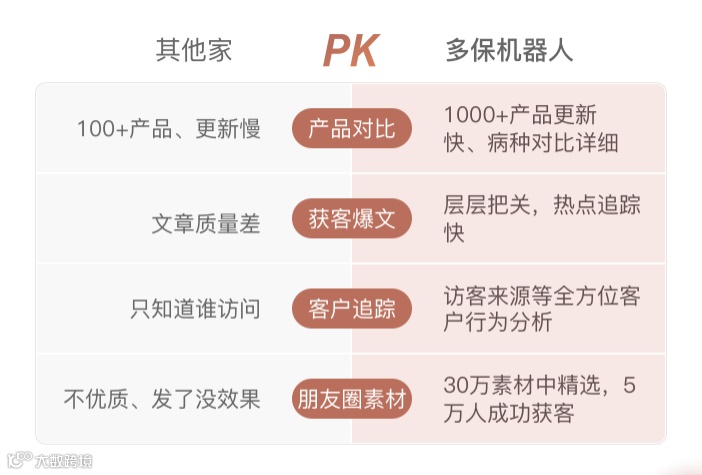 获取客户访客信息, 快速挖掘出潜在客户 通过传递优质保险文章,潜移默化影响客户需求 分享朋友圈素材,建立出专业保险顾问人设 使用产品对比功能,多维度分析出最适合客户的产品