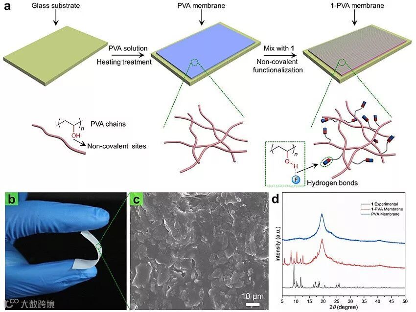 图2. (a) 复合型光驱动系统1-PVA的合成示意图。(b),(c),(d)分别为柔性复合薄膜1-PVA的照片,SEM图和PXRD图。