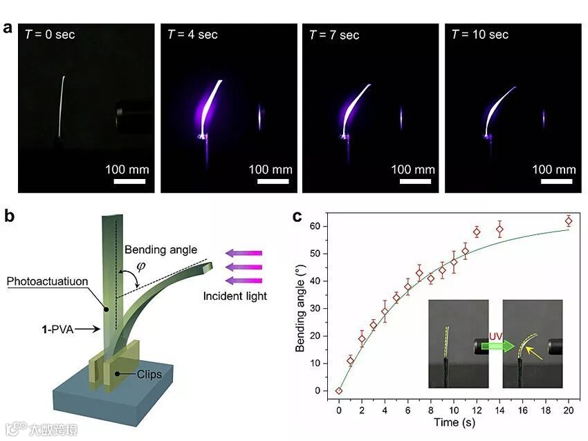 图3. 复合型光驱动系统1-PVA的光致弯曲机制。