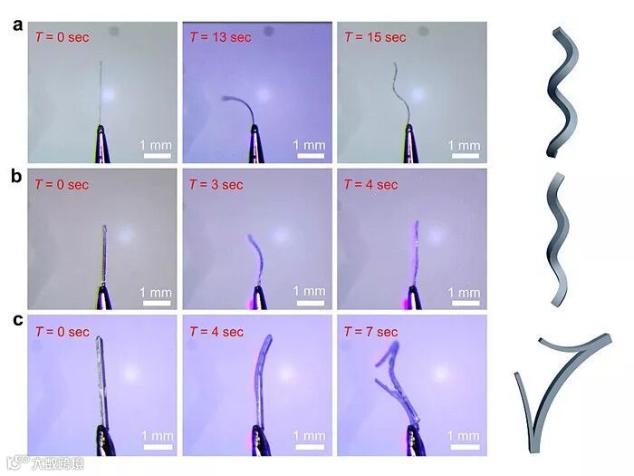 图1. 光响应晶体1在紫外光诱导下的光-机械形变光学显微图像。标尺为1 mm。