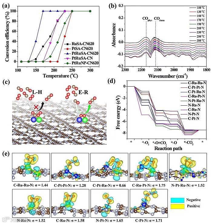 作者随后在连续流动固定床石英微反应器中进行CO催化氧化,以研究邻近Pt-Ru单原子之间的协同效应。结果表明,与RuSA-CN620、PtSA-CN620、PtRuSA-CN和PtRuNP-CN620相比,PtRuSA-CN620转化温度最低,为150℃(图4a)。这表明邻近Pt-Ru单原子和N空位对催化CO氧化具有协同促进作用,与活性C-Pt-Ru-N结构密不可分。在催化反应机理的研究中,作者发现,CO催化氧化可归于Eley-Rideal机理,CO吸附并非关键,而O2活化在CO催化氧化中起重要作用。PtRuSA-CN620中的C-Pt-Ru-N结构,通过一个Pt-O键和一个Ru-O键形成桥型O2吸附而在邻近Pt-Ru单原子之间有效活化O2(图4e),这对于PtRuSA-CN620的高催化活性非常关键。