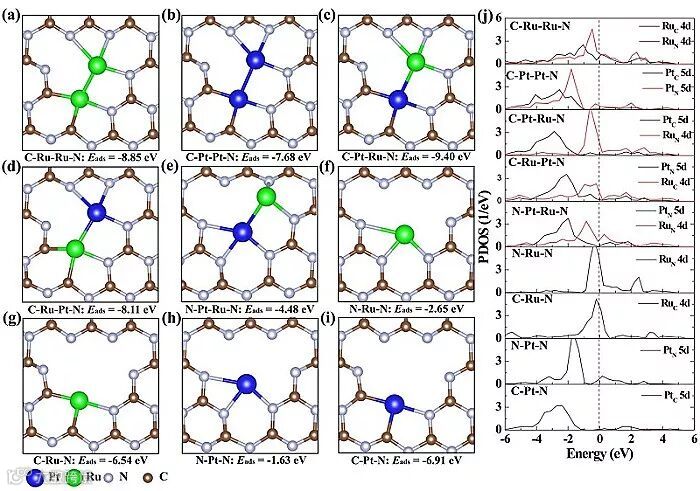 为了说明原子水平上邻近Pt-Ru单原子的配位结构与电子性质之间关系的起源,作者还进行了基于密度泛函理论(DFT)的理论模拟。基于Pt和Ru的配位环境,分为9个模型,即,C-Ru-Ru-N、C-Pt-Pt-N、C-Pt-Ru-N、C-Ru-Pt-N、N-Pt-Ru-N、N-Ru-N、C-Ru-N、N-Pt-N和C-Pt-N(图3a-3i)。计算结果证实,具有C-Pt-Ru-N配位结构的Pt-Ru单原子(图3c)比Ru-Ru/Pt-Pt单原子、孤立的Ru/Pt原子或其他Pt-Ru单原子更稳定,这要归因于它们通过形成两个Pt-C键、一个Pt-N键和三个Ru-N键而具有更负的吸附能。这些发现很好地解释了XAFS和XPS的结果。作者认为,这种在C-Pt-Ru-N结构中的富电子效应可能有利于某些还原依赖性的催化反应,例如用O2作为氧化剂的CO催化氧化。