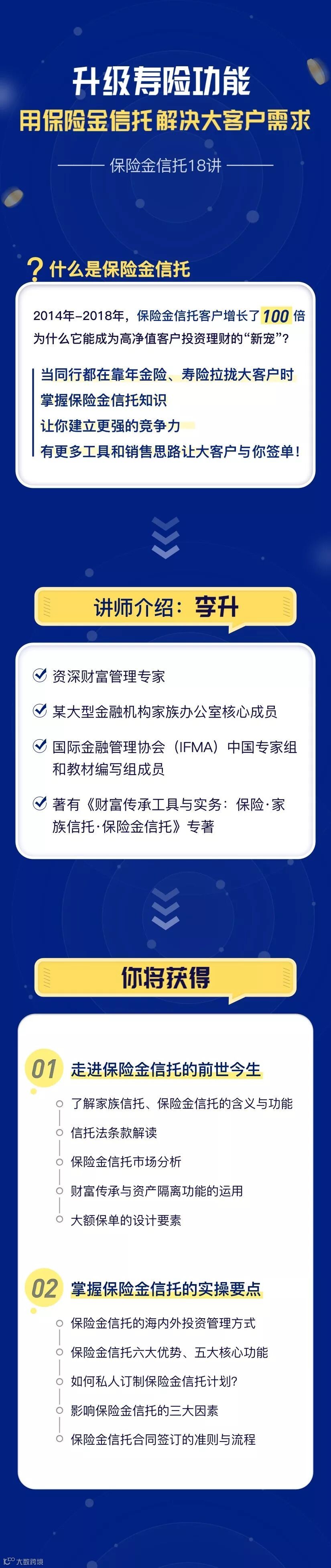 而此次多保学院联合李升老师,免费给大家上一门课程《保险金信托18讲》,帮助大家系统了解保险金信托,运用保险金信托解决大客户需求(文末免费领取)。