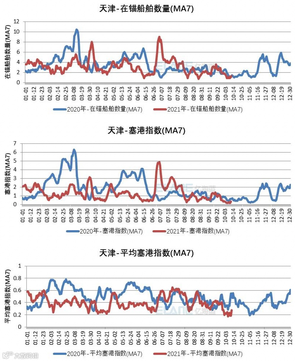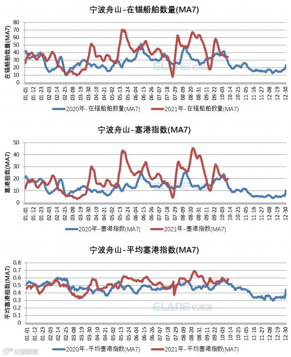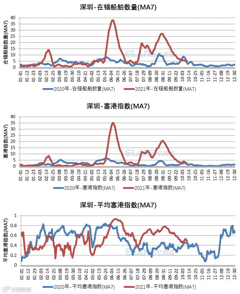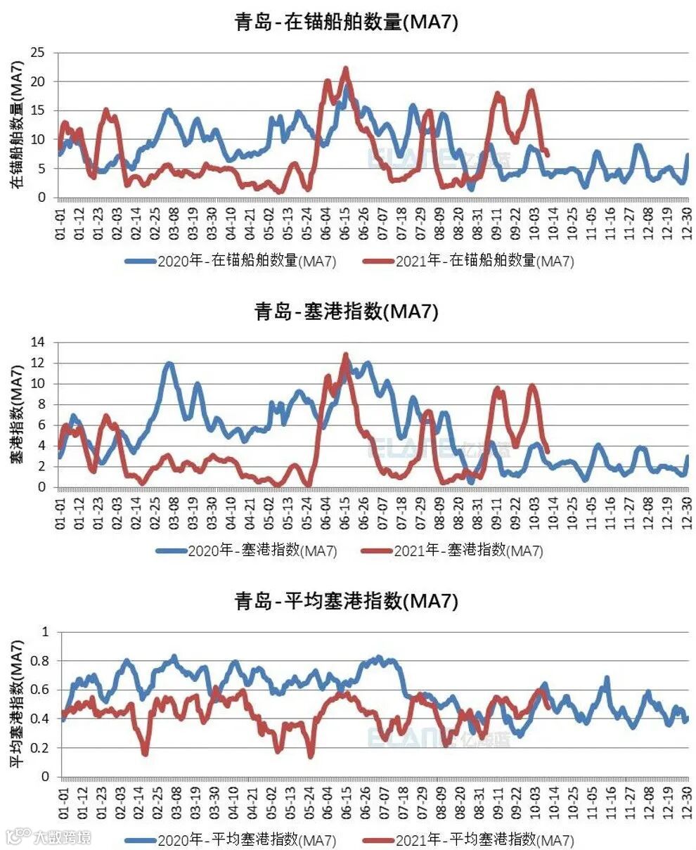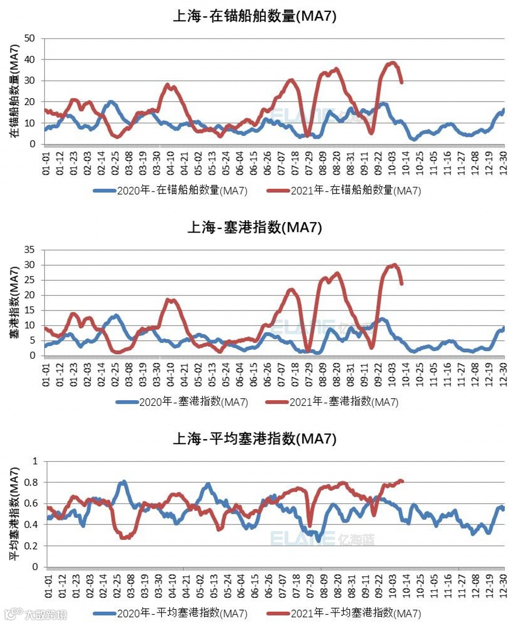 以2021年10月11日数据为例,上海港最新塞港指数为10.94,在锚地的船只数量为14艘,合计186999TEU,平均塞港指数为0.78。在锚等待时间中位数为47.63小时,在泊船只数量33艘,合计195692TEU。