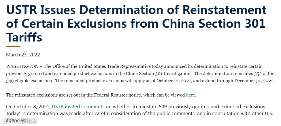 宣布重新豁免对352项从中国进口商品的关税,该新规定将适用于在2021年10月12日至2022年12月31日之间进口自中国的商品。