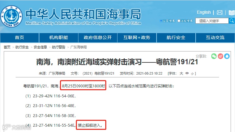 据广东海事局消息:粤航警191/21,南海,8月25日0900时至1800时,以下四点连线水域范围内进行实弹射击: