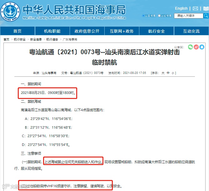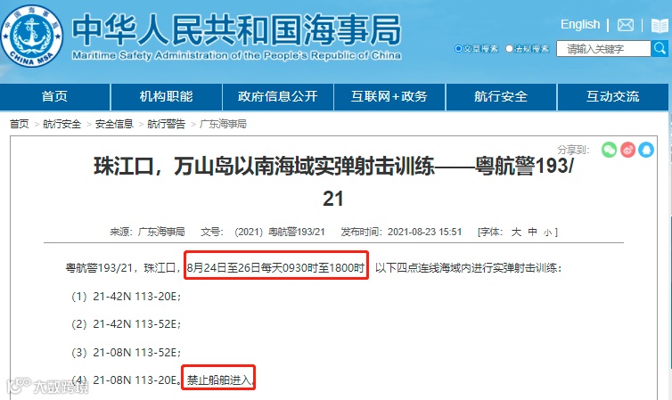 据广东海事局消息:粤航警193/21,珠江口,8月24日至26日每天0930时至1800时,以下四点连线海域内进行实弹射击训练: