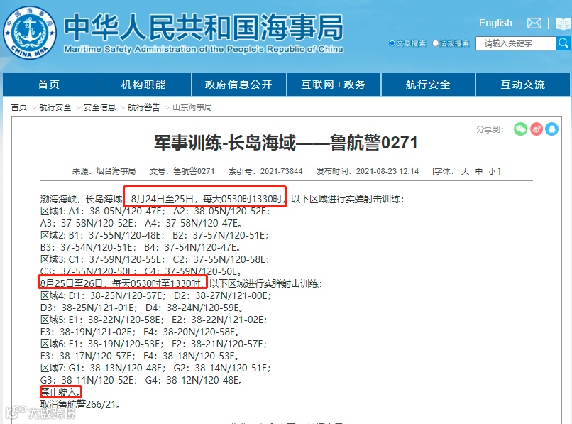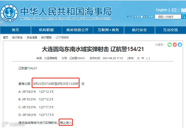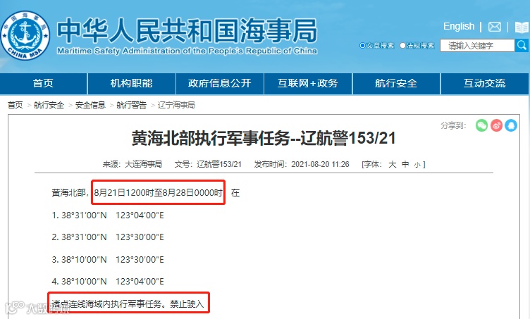 据大连海事局消息:辽航警154/21,黄海北部,8月23日0730时至8月25日1330时,在