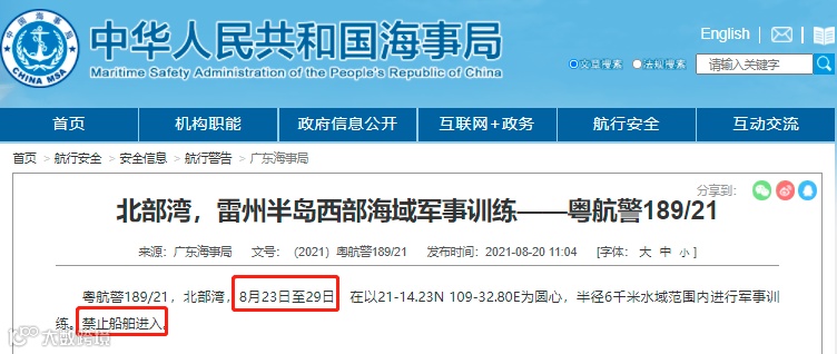 四、北部湾,雷州半岛西部海域军事训练——粤航警189/21