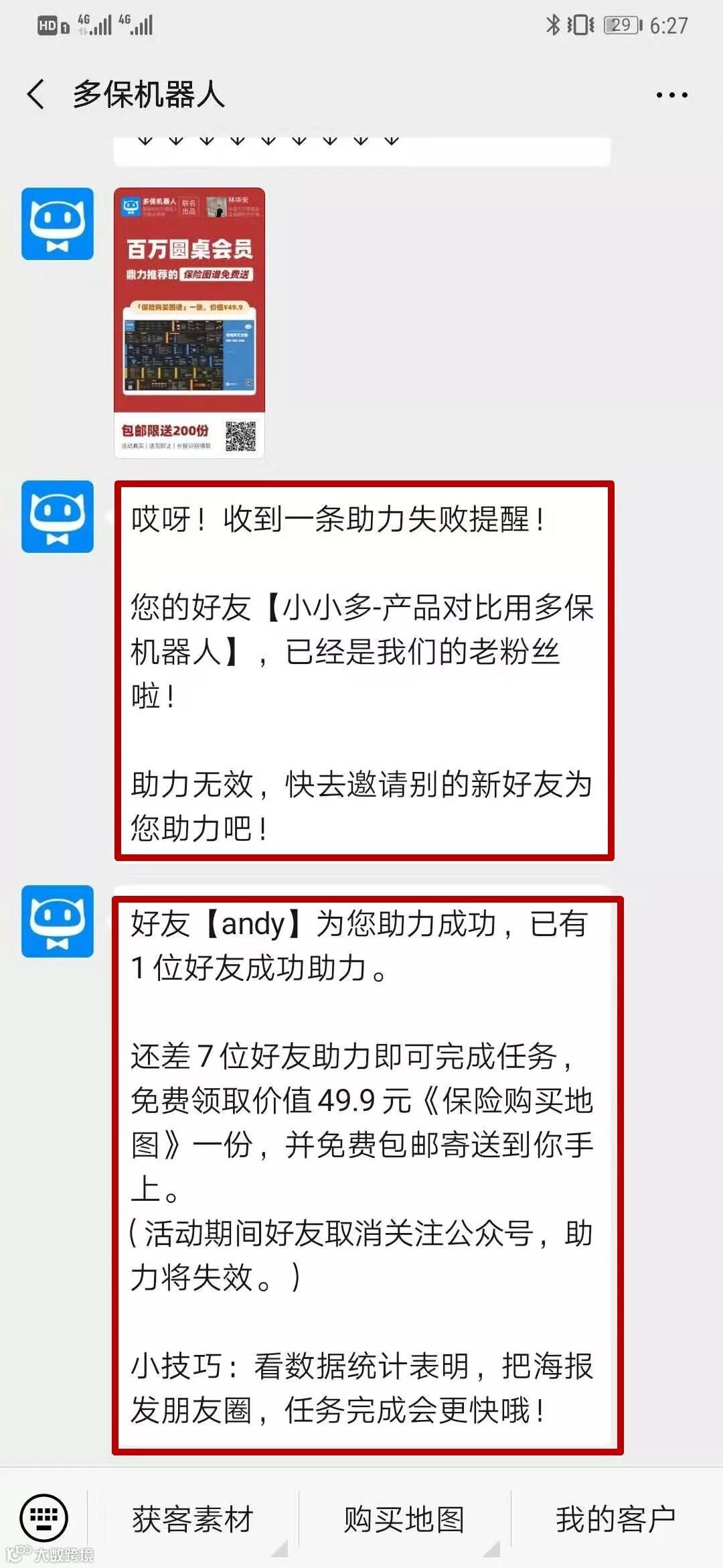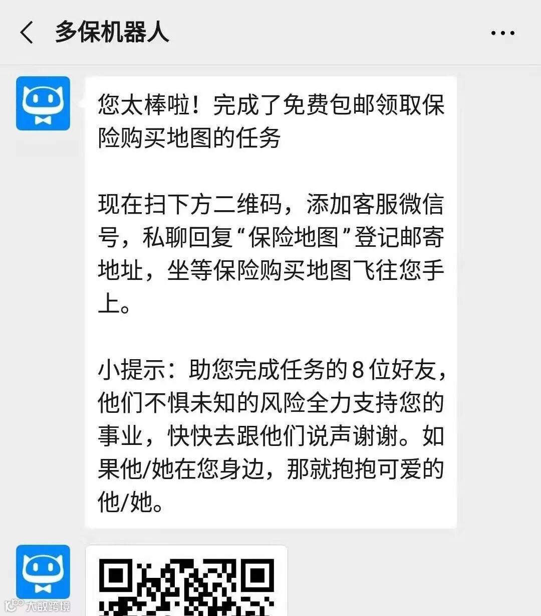 有朋友通过扫描二维码关注微信公众号,就会有实时提醒进度,需要邀请没有关注过【多保机器人】公众号的用户,才算是助力成功。
