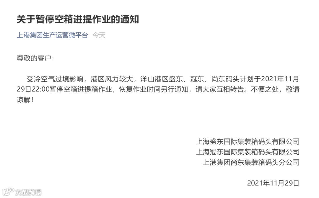 11月29日,上港集团生产运营微平台发布关于暂停空箱进提作业的通知,通知显示,受冷空气过境影响,港区风力较大,