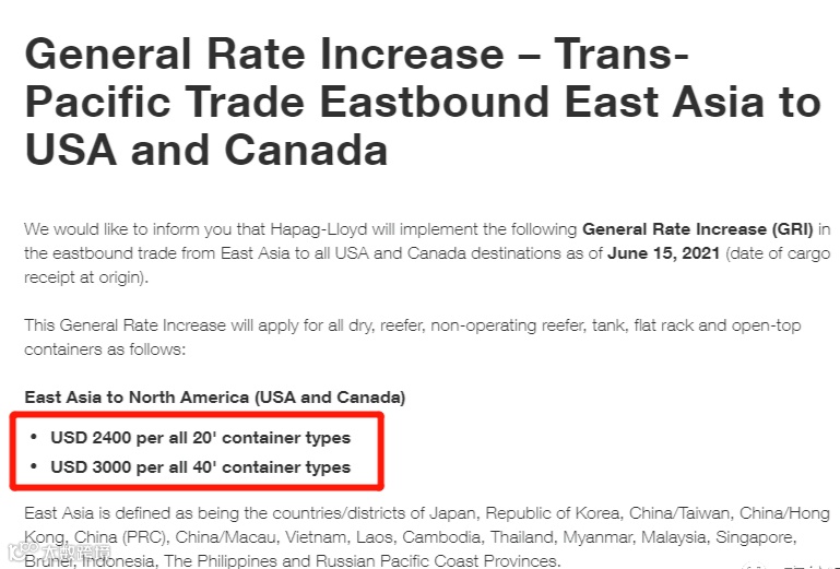 此前,赫伯罗特已经宣布从6月15日大幅上调亚洲到北美运费(GRI),其中小柜涨USD2400,大柜涨USD3000。