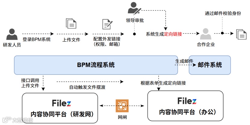 Filez 提供开放 API,可对接现有 BPM工作流平台。当业务流转到“文档外发”节点时,根据员工填写的表单项,自动调用 Filez 完成上传、权限分配、外发审批。