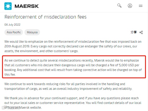 由于最近持续发现多起误报事件,马士基在此强调,所有误报危险货物的客户,每次订舱将被收取5000美元的费用。因采取纠正措施而产生的任何费用将在此费用基础上额外收取。