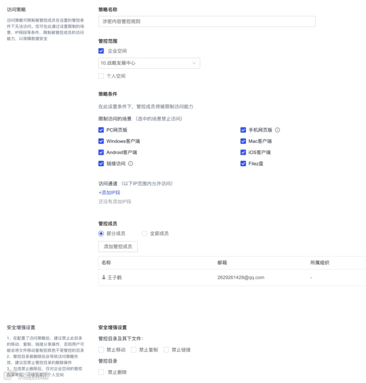 2. 在此基础上安全策略还支持管控目录、终端类型、人员范围、IP范围多维度灵活配置