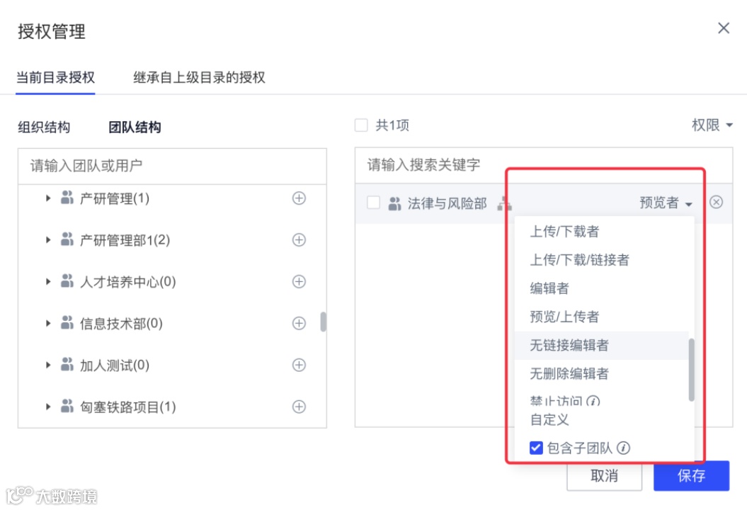 3. 在此基础上,企业也可以通过授权管理功能给对应的部门和用户授予对应的权限,通过精细化的权限配置保证用户在对应的目录内权限合理。