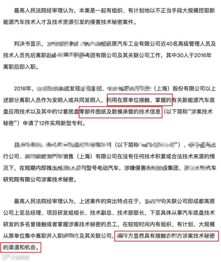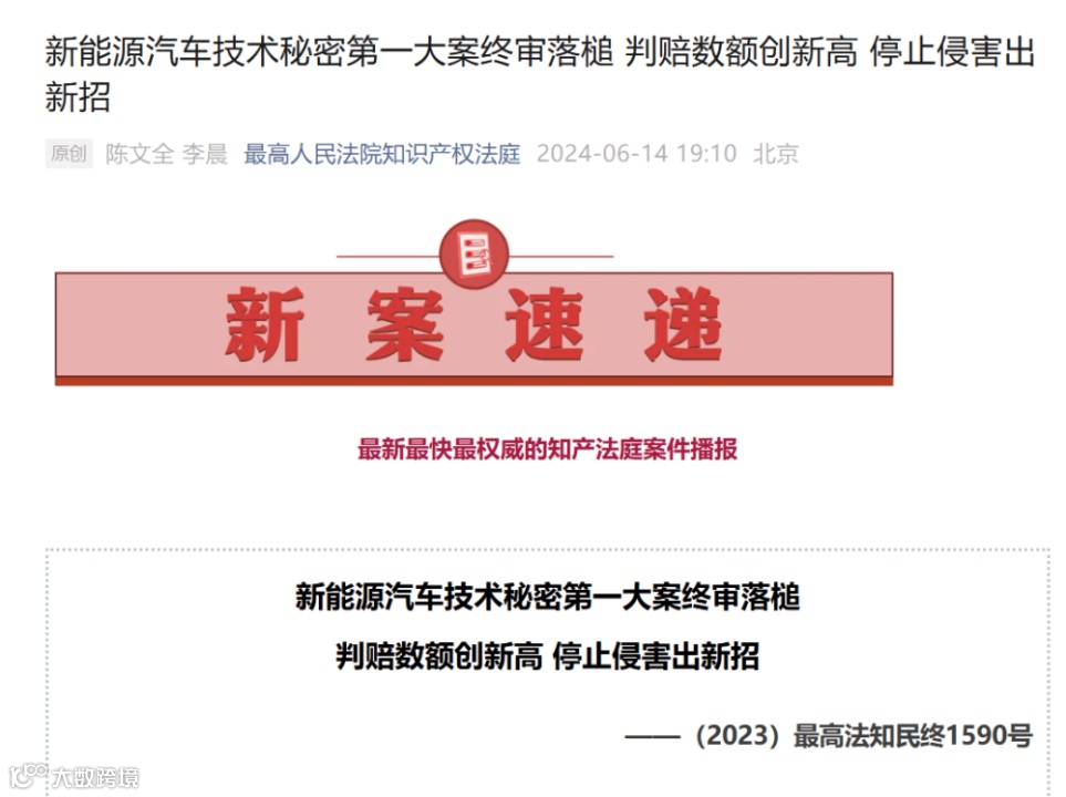 就在2024年6⽉14⽇,“最⾼⼈⺠法院知识产权法庭”公众号发布消息称,最⾼⼈⺠法院知识产权法庭审结了⼀起新能源汽⻋技术泄密纠纷上述案。