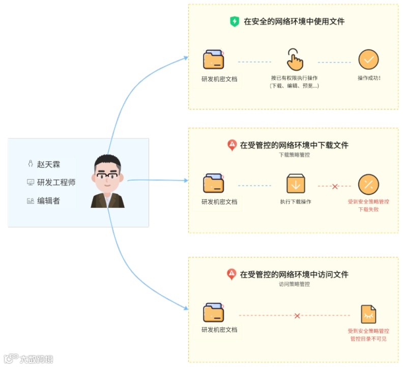 1. 提供目录访问策略功能,企业可以限制用户非安全网络环境中使用文件的能力,有效防止数据泄漏,通过精细化的配置可以帮助企业轻松实现跨网办公的核心需求。