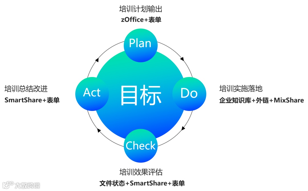 在完成了新员工账号和资料权限的初始化后,接下来就要对新员工提供入职培训了。人力资源可以利用Filez,依据PDCA循环来开展培训工作。从培训计划输出(Plan),培训实施落地(Do),培训效果评估(Check)培训总结改进(Act)四个方面探讨企业培训,规范和约束企业员工行为。联想Filez用PDCA循环的原理设计了整个人力资源在提高培训效果上的应用场景。