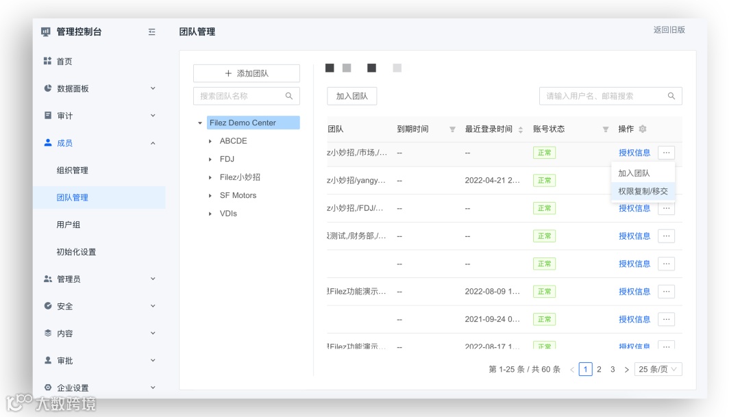 如果新员工是项目成员,为了更方便的跟进项目进度,人力资源可以批量移交该员工前任的工作移交资料给新员工,可以让业务经理配合,通过联想Filez团队管理对他进行授权,一键权限复制和移交前任员工的权限,或者从现任的工作内容相近的员工复制权限,来进入指定的项目文件夹。这样新员工就能跟同等职位的同事一样拥有(预览、上传、下载等)权限了。在这个过程中,也可以对项目目录进行筛选,只挑选部分项目进行移交或复制。