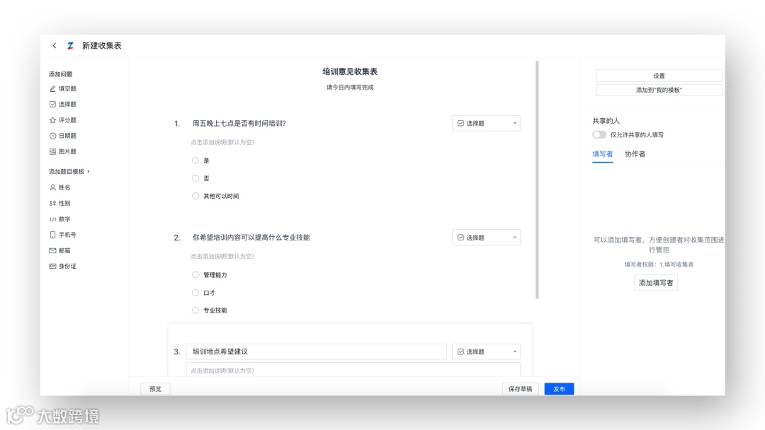 最后可以通过表单设置提问了解员工对于培训的反馈,比如员工对于本次培训的学习是否理解,对培训内容的建议,以及下次培训改进建议。