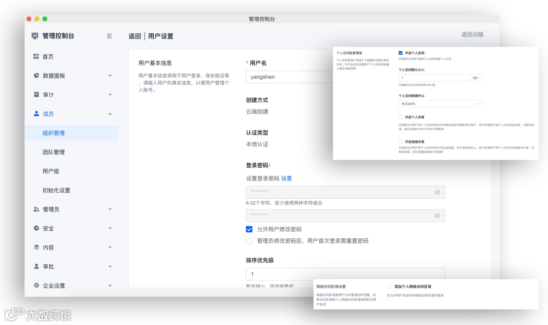 人力资源可以通过OA流程或者告知IT管理员,进行新员工账号初始化,联想Filez的组织管理可以自动从AD或者OA,人力资源主数据系统等,同步新员工信息,并自动设置新员工的部门权限,比如对于部门内文件夹预览、下载、上传等权限,用户登录、身份验证等信息,新员工的Filez个人空间容量上限和共享权限。人力资源可以根据该员工的岗位和工作角色,来定义一个安全级别,由IT管理员设置安全策略,例如:新员工允许登录系统的IP范围,是否可以在公共网络区域下载公司文件等。